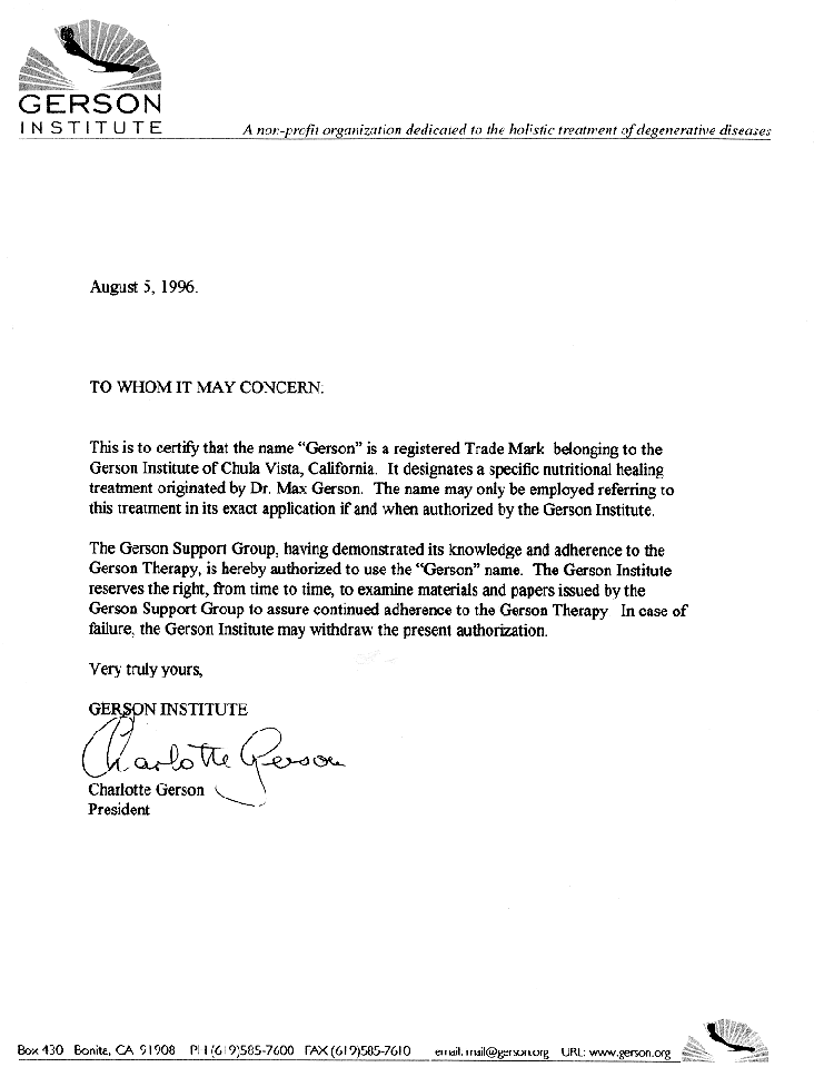 This website gives a brief introduction to the Gerson Therapy® and what it entails as well as outlining the help offered by the Gerson Support Group to patients undertaking the full therapy. The GSG does not offer any medical advice, treatment or diagnosis and patients are advised to seek qualified help before embarking on the therapy.